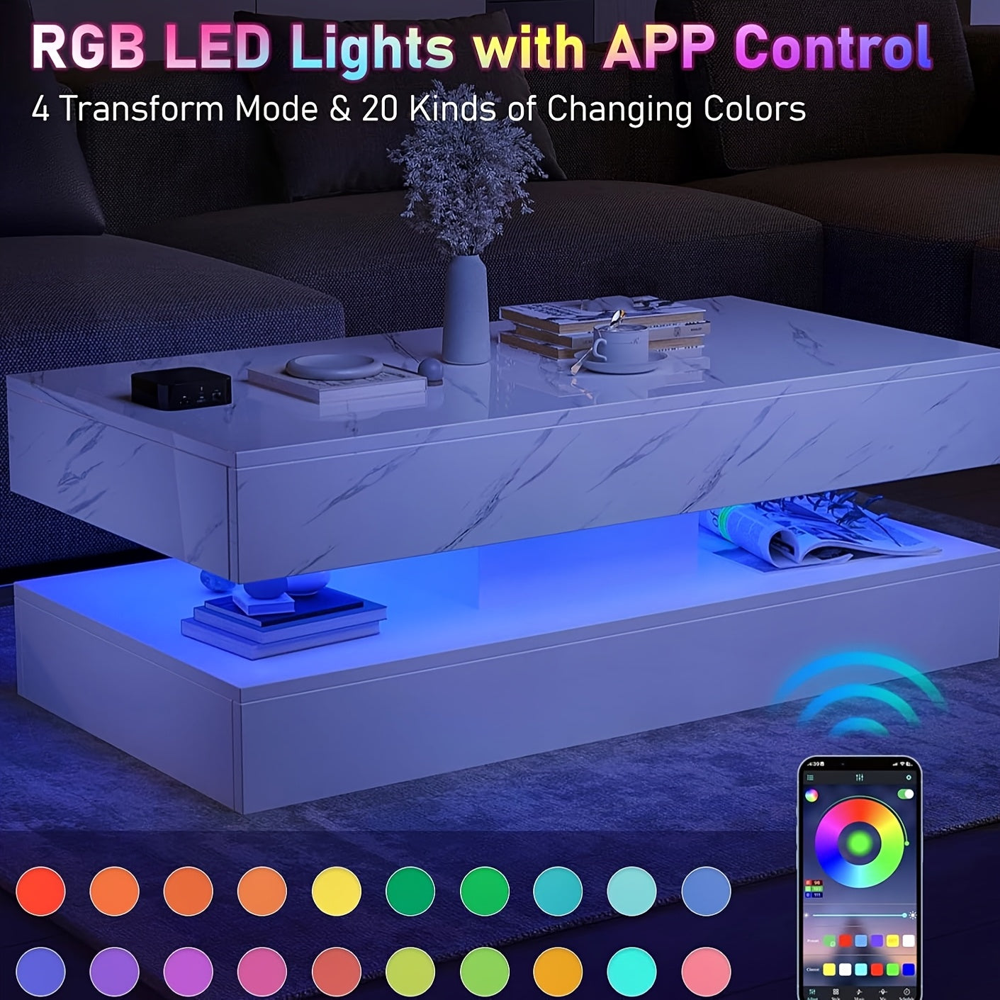 White LED Coffee Table with 2 Storage Drawers, Modern High Gloss Coffee Table w\u002F20 Colors LED Lights, 2 Tiers Rectangle Center Table for Living Room with Marbling Print, APP Control, Black